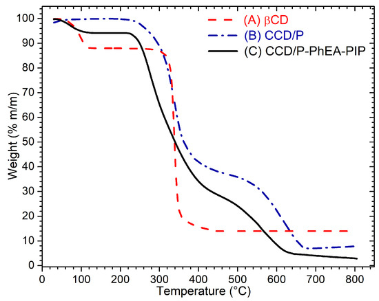 Thermogravimetric decomposition curves of (A) βCD, (B) CCD/P, and (C) CCD/P-PhEA-PIP in a temperature range between 10 and 800 °C in an atmosphere of N2.