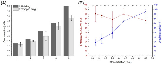 (A) Bar graph comparing the initial concentration of PhEA-PIP and the concentration of PhEA-PIP entrapped in the CCD/P in five different assays (n = 3). (B) Percentages of entrapment efficiency (left) and loading capacity (right) of CCD/P with both drugs, at different concentrations.