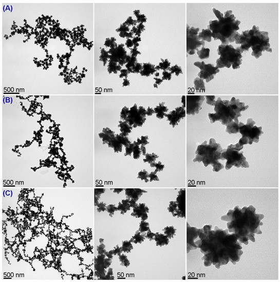 TEM micrographs of (A) AuNSs, (B) AuNS-CCD/P, and (C) AuNS-CCD/P-PhEA-PIP at an acceleration voltage of 200 kV.
