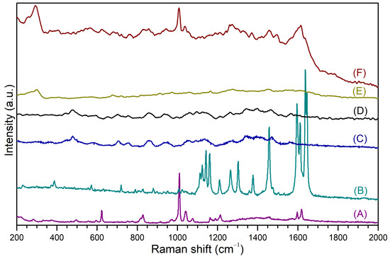 The Raman spectra of PhEA (A) and PIP (B) were directly compared to the SERS spectrum of AuNS-CCD/P-PhEA-PIP (F). The CCD/P (C) and CCD/P-PhEA-PIP (D) systems showed similar Raman spectra; thus, it was not possible to assign or recognize the signals of both drugs. The registered signals and their assignments are shown in Table 3.