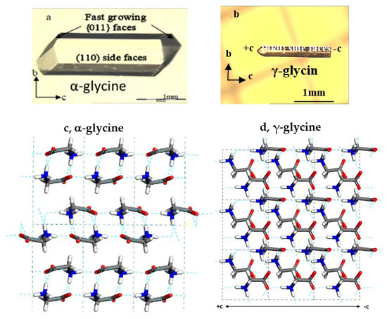 Glycine (NH2CH2COOH), the simplest amino acid, is a classical polymorphic system which has played an important part in polymorphic studies. In an aqueous solution, glycine molecules exist as zwitterions (+NH3CH2COO−). In solid state under ambient conditions, it has three polymorphs [15]: the most stable γ-glycine (γ-form), the metastable α-glycine (α-form) and the least stable β-glycine (β-form), belonging to space group P31 (or P32), P21/n and P21, respectively (refer to Table S1 in the Supplementary Materials for more properties [16,17,18] of these three polymorphs). Glycine solids have applications in treating health problems [19]. Interestingly, it was found that, compared with α-glycine, γ-glycine exerts a beneficial effect on the behavior of catalepsy-prone rats [19], highlighting the importance of controlling glycine polymorphs.