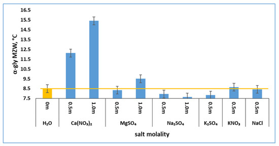 Effect of three salts on the MZWs of γ-glycine nucleation (error bar = ±0.4 °C).