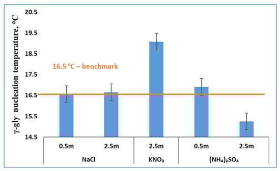 Effects of three salts on the nucleation temperature of γ-glycine (error bar = ±0.4 °C).
