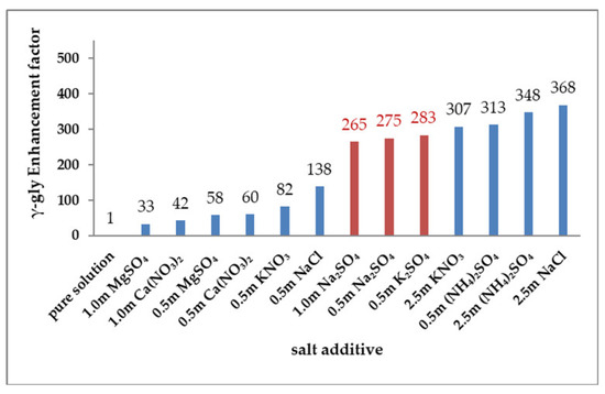 These new enhancement factors of γ-glycine secondary nucleation during SMPT in the presence of Na2SO4 and K2SO4, together with those reported in our earlier study [12], are presented in Figure 5. As shown in Figure 5, all the salts greatly promote the secondary nucleation of γ-glycine. Even the smallest enhancement factor at 1 m MgSO4 is up to 33 (which means 1 m MgSO4 increases γ-glycine secondary nucleation rate by 33 times). In fact, except Ca(NO3)2, MgSO4 and 0.5 m KNO3, all other salts exerted an even greater promoting effect on γ-glycine secondary nucleation, as evidenced by the corresponding enhancement factors, which are larger than 100 (Figure 5).
