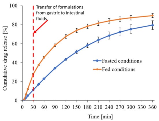 Figure 1 demonstrates the In Vitro release profiles of the Xarelto IR tablet (20 mg) in fasted and fed conditions using the dynamic dissolution method. After 30 min, In Vitro release of Xarelto IR tablet in the fed state and fasted simulated gastric fluids were found to be 27.7 and 11.0%.