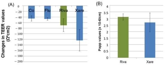 (A) Differences in transepithelial electrical resistance (TEER) values between the start value and measurement at the end of the permeation studies. Abbreviations: Control (Co), fluorescein (Flu), rivaroxaban (Riva), Xarelto (Xare). (B) Papp values of rivaroxaban (Riva) and Xarelto (Xare).