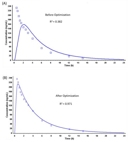 Riva plasma concentration–time profile from solution oral dose (10 mg) (A) before and (B) after optimization.