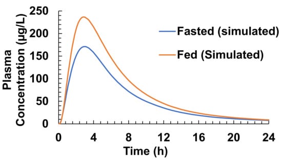 The developed ACAT model was used to simulate the plasma concentration–time profile of Xarelto (20 mg dose strength) in the fasted and fed state with the dissolution profiles using the USP 4 flow-through apparatus and biorelevant dissolution medium. It was observed that the inclusion of dissolution profiles of Xarelto IR Tablet (20 mg) during modeling led to an improvement in the simulations with predicted values close to the observed values, as reported in the literature. Table 7 and Figure 5 represent the simulated plasma concentration–time profile and key pharmacokinetic parameters predicted from the simulation of Xarelto (20 mg) IR tablet in the fasted and the fed states.