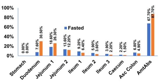 As evident from Figure 6, the increase in bioavailability of Xarelto during the fed state simulation was found, which could be due to the enhanced dissolution of Riva in the fed state. The increase in solubility in the fed state resulted in a greater fraction of Riva to be absorbed from the duodenum and Jejunum 1 as compared to the fasted state. The simulated results are in accordance with the Xarelto product literature outlining site-specific absorption of Riva [,].