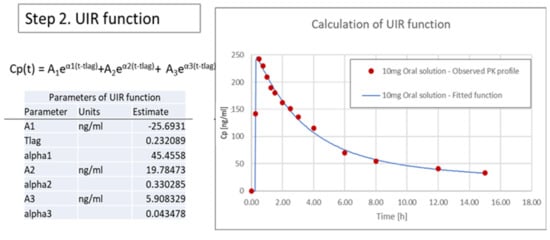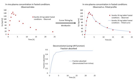 IVIVC was based on a two-step deconvolution method. Initially, the Weibull function was fitted to the In Vitro data of the Xarelto IR tablet (20 mg tablet) in the fasted condition. Moreover, the time course of In Vivo absorption was derived using deconvolution. The In Vivo data of the 10 mg oral solution published by Kubitza were used as a reference for calculating the unit impulse response (UIR) function [,]. The In Vivo data of the PK profiles of the Xarelto IR tablet (20 mg tablet) were then deconvolved and compared to the In Vitro dissolution profiles using the fraction absorbed (Fabs) vs. the fraction dissolved Fdiss plot.