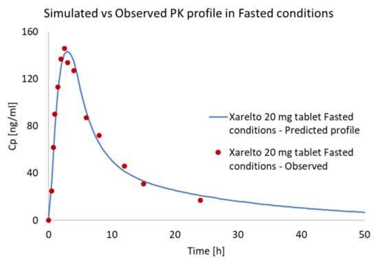 Thereafter, as the final step, validation of the developed IVIVC model is required, in order to establish quantitative resilience of the predictive capacity of the model. The validation of the model was performed using the results of the In Vivo fate of the formulation used to establish the model, known as internal validation, and/or by the application of a different formulation, known as external validation. In the present model development, the internal validation of the IVIVC model was performed by comparing the predicted and observed PK profile of the reference product Xarelto 20 mg tablet in the fasted condition. Thereafter, the predictability of the model was evaluated using the percentage prediction error (%PE) from the following equation: