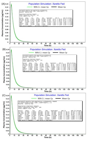 A single-dose (20 mg), three-period virtual trial in 50 subjects was carried out. GastroPlusTM randomly generates subjects by varying physiological factors such as gastrointestinal transit times, pH, fluid volumes, PK parameters as well as compound parameters. Three populations, namely A, B, and C, with 50 subjects each (in order to gain a thorough sampling across all the variables) were given the same treatment (20 mg strength of Xarelto IR tablet).