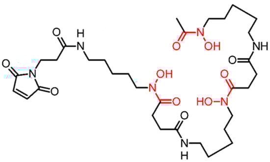 Comparison of siderophore-based chelators fusarinine C (FSC) and desferrioxamine B (DFO) for labelling of ZEGFR:2377 affibody molecules with 89Zr also revealed an obvious influence of radionuclide–chelator combinations on biodistribution properties []; particularly, the use of DFO for high-temperature labelling provided better contrast. For site-specific labelling of ZEGFR:2377, a maleimido derivative of desferrioxamine B (N-[5-[[4-[5-[acetyl(hydroxy)amino]-pentylamino]-4-oxobutanoyl]-hydroxyamino]pentyl]-N0-(5-aminopentyl)-N0-hydroxybutanediamide, DFO) was conjugated to a unique C-terminal cysteine of this affibody molecule (Figure 1).