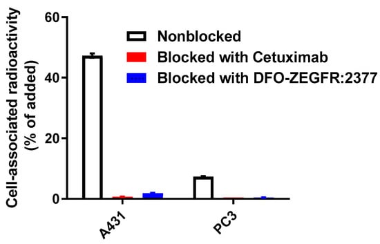 In Vitro specificity of [66Ga]Ga-DFO-ZEGFR:2377 conjugate bound to A431 and PC3. Cells were incubated with 5 nM [66Ga]Ga-DFO-ZEGFR:2377. A total of 500 nM of blocking agent was used to confirm the epidermal growth factor receptor (EGFR)-specificity of the conjugate. The data are presented as the average (n = 3) and SD.