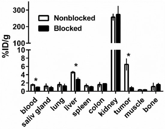The in vivo specificity of [66Ga]Ga-DFO-ZEGFR:2377 binding to EGFR in tumor xenografts was evaluated by pre-saturation of receptors using the monoclonal anti-EGFR antibody cetuximab, which binds to the same epitope as ZEGFR:2377 (Figure 4). Tumor uptake in the blocked group was significantly (p < 0.005) reduced compared with the unblocked group, indicating highly EGFR specific accumulation of [66Ga]Ga-DFO-ZEGFR:2377 in EGFR-expressing tumors. In addition, the liver uptake showed significant reduction (p < 0.005) in the blocked group compared with the unblocked group.