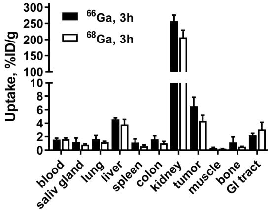 Biodistribution of [66Ga]Ga-DFO-ZEGFR:2377 and [68Ga]Ga-DFO-ZEGFR:2377 conjugates in BALB/C nu/nu mice bearing EGFR-expressing A431 xenografts at 3 h p.i.. The data are presented as the average (n = 4) and SD.