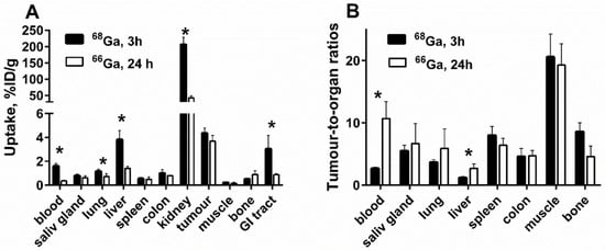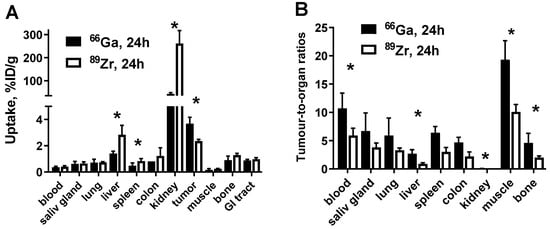 Comparison of biodistribution (A) and tumor-to-organ ratio (B) of [68Ga]Ga-DFO-ZEGFR:2377 and [66Ga]Ga-DFO-ZEGFR:2377 BALB/C nu/nu mice bearing EGFR-expressing A431 xenografts at 3 and 24 h p.i., respectively. The data are presented as the average (n = 4) and SD. Asterisk (*) marks significant (p < 0.05) difference.