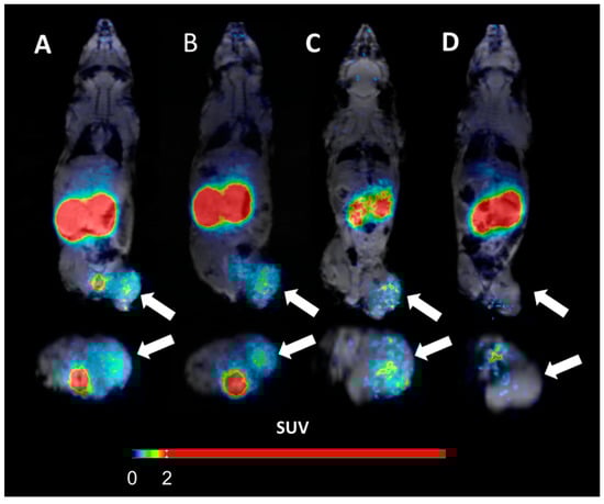 microPET/MRI imaging of EGFR-expression in A431 xenografts using [66Ga]Ga-DFO-ZEGFR:2377 at 3 h (A), 6 h (B), and 24 h (C) p.i. To confirm the in vivo specificity of [66Ga]Ga-DFO-ZEGFR:2377, EGF receptors were saturated in one animal (Panel (D)) by subcutaneous injection of 550 mg/kg cetuximab 24 h before injection of [66Ga]Ga-DFO-ZEGFR:2377 and imaging was performed at 3 h after tracer injection. Arrows point at tumors.