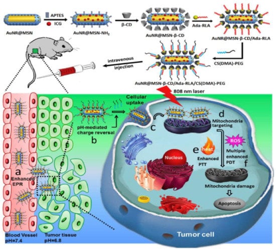 A nanoplatform of AuNR@MSN-RLA/CS(DMA)-PEG was also proposed for the combinational PDT/photothermal therapy (PTT) of MCF-7 breast cancer []. Gold nanorods were coated with mesoporous silica (AuNR@MSN) and β-cyclodextrin (β-CD), as well as loaded with Indocyanine green (ICG) []. The nanoplatform was then grafted with an Ada modified RLA peptide ([RLARLAR]2), to enhance plasma membrane permeability and mitochondria-targeting capacity to form AuNR@MSN-ICG- β-CD/Ada-RLA []. Then 2,3-dimethylmaleic anhydride (DMA)-modified chitosan oligosaccharide-block-poly (ethylene glycol) polymer (CS(DMA)-PEG) was coated onto the surface of AuNR@MSN-ICG- β-CD/Ada-RLA to serve as a charge-switchable and anti-fouling layer (Figure 3) []. Within in vitro MCF-7 BC cytotoxicity assays, the nanoconjugate showed no obvious toxicity prior to laser irradiation []. MCF-7 cells treated with AuNR@MSN-ICG- β-CD/Ada-RLA/CS(DMA)-PEG at pH 6.8 displayed a higher inhibition and cellular uptake when compared to AuNR@MSN-ICG, suggesting that CS(DMA)-PEG coating protected the nanoplatform from hydrolysis, and so promoted cancer cell uptake []. Moreover, the weak acidity microenvironment of cancer cells could reverse the charge of the AuNR@MSN-ICG- β-CD/Ada-RLA/CS(DMA)-PEG nanoplatform, promoting mitochondrial targeting and overall improved ROS generation []. When MCF-7 BC cells were treated with the nanoconjugate and 808 nm NIR laser irradiation, the AuNR@MSN-ICG- β-CD/Ada-RLA/CS(DMA)-PEG complex noted the highest PDT and PTT inhibition relative to control groups, due to its overall stability and superior ROS, which was mediated by the plasmonic photothermal effects and local electric field of the DMA AuNR []. In vivo investigations within xenograft nude mouse models noted a higher tumor temperature in mice treated with AuNR@MSN-ICG- β-CD/Ada-RLA/CS(DMA)-PEG than when compared to those treated with AuNR@MSN-ICG, suggesting the DMA coated nanoconjugates were far more superior at treating BS in combination with PDT and PTT therapy [].