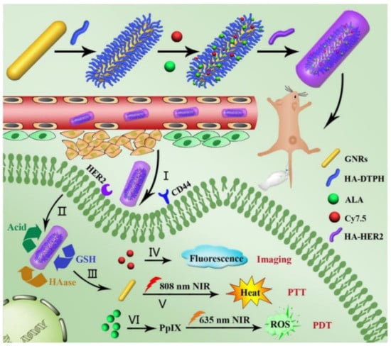 Schematic illustration for preparing GNR-HA-ALA/Cy7.5-HER2 with triple-responsive drug release and its application for HER2/CD44 dual-targeted and fluorescence imaging-guided combined PDT/ photothermal therapy (PTT) treatment of breast cancer. Reprinted with permission from reference []. Copyright 2019 Elsevier.