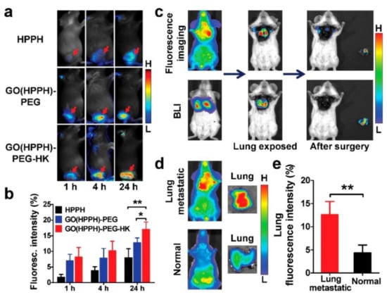 (a) Optical images of 4T1 tumor-bearing BALB/c mice, (b) quantitative analysis uptake by 4T1 tumors after injection of HPPH, GO(HPPH)-PEG, or GO(HPPH)-PEG-HK, (c) In vivo optical imaging and BLI of 4T1-fLuc tumor-bearing BALB/c mice after injection of GO(HPPH)-PEG-HK. (d,e) Optical images and quantitative analysis of lung uptake of GO(HPPH)-PEG-HK by 4T1-fLuc tumor-bearing and normal BALB/c mice at 24 h post-injection. Reprinted with permission from reference []. Copyright 2017 American Chemical Society. * p < 0.05, ** p < 0.01.