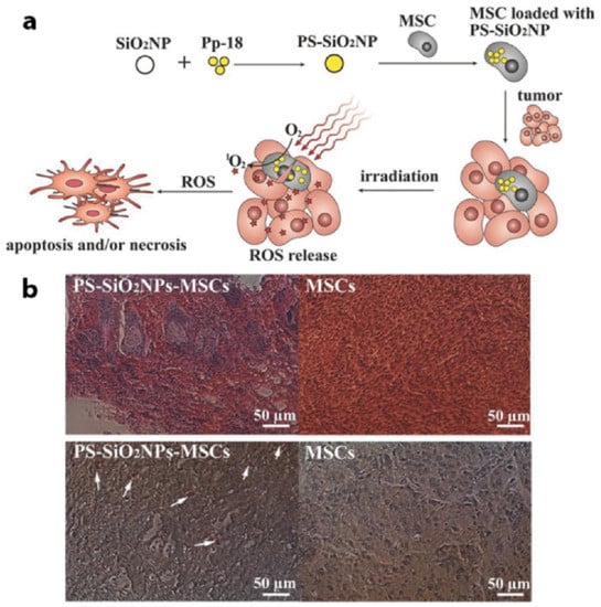 (a) PDT treatment of cancer cell using PS-loaded SiO2NPs into MSCs, (b) In vivo PDT treatment on tumors one day after co-injection of MCF-7 cancer cells and MSCs with (group 1: PS-SiO2NPs-MSCs group) or without (group 2: control MSCs group) PS-SiO2NPs loaded. Reprinted with permission from reference []. Copyright 2014 Willey Online Library.