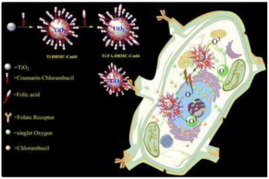 Studies by Gangopadhyay et al. (2015), constructed TiO2 NPs and decorated them with a 7,8-dihydroxy coumarin PS chromophore and chlorambucil (Ti-DBMC-Cmbl NPs) and FA (Ti-FA-DBMC-Cmbl NPs) to serve as a chemotherapeutic drug and phototrigger, respectfully in PDT/chemotherapy treatments of in vitro cultured MDA-MB BC cells (Figure 8) []. After 60 min of PDT laser irradiation at ≥410 nm, cells treated with Ti-DBMC-Cmbl NPs noted a 35% cell viability, whereas cell treated with Ti-FA-DBMC-Cmbl NPs reported a mere 19% cell viability and more significant apoptotic cell death []. Overall, results revealed that the synergic effect of both targeted PDT and well known chemotherapeutic drug chlorambucil was successful for the eradication of MDA-MB BC cells [].