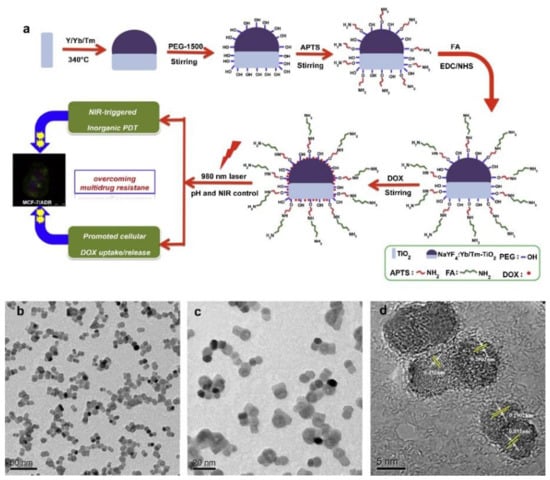 - Zeng, L.; Pan, Y.; Tian, Y.; Wang, X.; Ren, W.; Wang, S.; Lu, G.; Wu, A. Doxorubicin-loaded NaYF4:Yb/Tm–TiO2 inorganic photosensitizers for NIR-triggered photodynamic therapy and enhanced chemotherapy in drug-resistant breast cancers. Biomaterials 2015, 57, 93–106. [Google Scholar] [CrossRef]