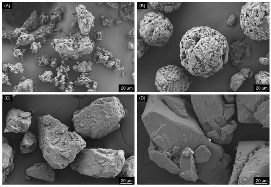 Scanning electron microscopy images of the different grades of lactose selected for this study: (A) Lβ, (B) LHα-sph, (C) LHα-tom-sm and (D) LHα-tom-larg.