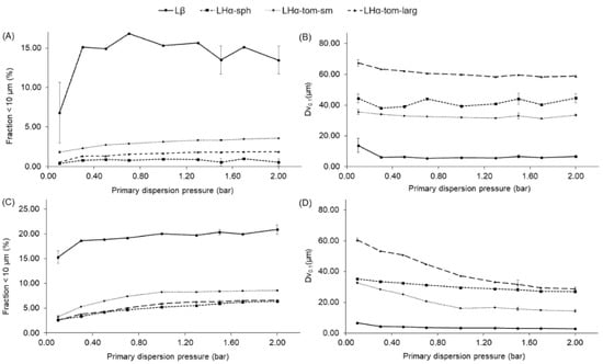 To investigate the dispersion behavior of the particles with the potential to reach the large and small respiratory airways, the fraction <10 µm and the 10th percentile of the particle size distribution by volume(Dv0.1) [17] were analyzed by pressure titration. As seen in Figure 2A,B only the PSD of Lβ was influenced by different PDPs. For instance, its fraction of particles <10 µm doubled when increasing the PDP from 0.1 to 0.3 bar, then remained the unchanged. A similar trend was found for the evaluation of the Dv0.1 of Lβ across the used PDPs.