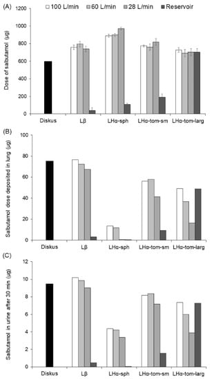 Based on the aerodynamic profiles of SS determined from the NGI performance in vitro, the lung deposition of SS as well as its plasma concentration profiles were predicted in silico. To evaluate the performance of the different formulations, the delivered dose, lung deposition and the concentrations of non-metabolized salbutamol in urine after 30 min were evaluated (Figure 5) [24]. It was possible to observe that the dose was barely impacted by the airflow; however, a notably lower mass of API was emitted from the inhaler when the reservoir was used, with the exception of the LHα-tom-larg where no such effect was observed. The dose of SS arriving to the lung and the mass of non-metabolized salbutamol in the urine 30 min after administration followed similar trends. This confirmed that the latter is a good descriptor to evaluate the relatively bioavailability of salbutamol in the lung. Consequently, it was observed that a decrease in the airflow resulted in less salbutamol being available in the lung, and this was particularly evident for the LHα-tom-larg blend. The Lβ + SS blend was less affected, and for the LHα-tom-sm + SS mixture, only notable smaller doses were seen at 28 L/min. Compared to the other carriers, the blends of the API with LHα-sph led to a remarkably smaller dose of salbutamol arriving to the lung. For the reservoir device, only the blends containing LHα-tom-larg were able to generate salbutamol concentrations comparable to Cyclohaler®.