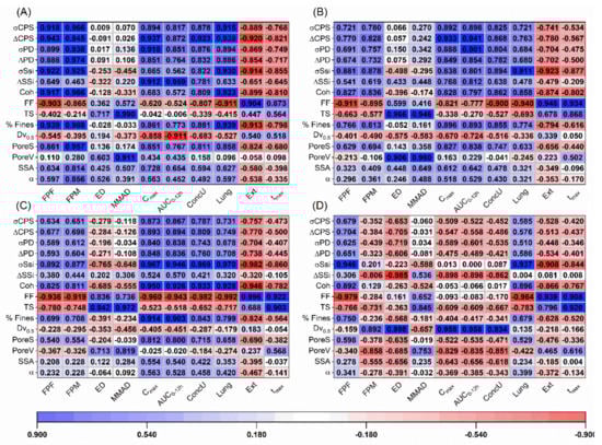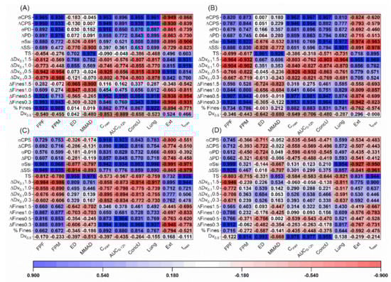 Pearson correlation coefficients between blend properties and the in vitro–in silico performance of the capsule-based device at (A) 28 L/min, (B) 60 L/min as well as (C) 100 L/min and of the (D) reservoir inhaler (bulk properties and respective nomenclature can be found in the supplementary material Table S3).