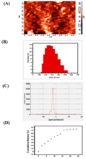 (A) Atomic Force Micrographs (AFM) of SEMG (2D and 3D image), (B) particle size distribution of the SEMG, (C) zeta potential measurement of SEMG, (D) In vitro release kinetics of Methyl Gallate (MG) from SEMG.