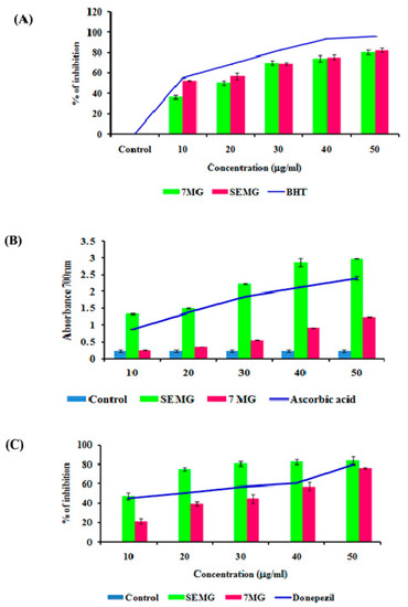 Mounting evidences revealed that oxidative stress observed in early stages of AD plays a vital role in triggering complex signaling pathways, leading to pathogenesis of AD and lesion formation [40]. Antioxidant therapies were recently observed to be successful in preclinical trials for the treatment of AD. In the present study, the antioxidant capacity of SEMG was assessed and the results were shown in Figure 3A,B. Results of the present study illustrated that nano-encapsulated drugs showed potent free radical scavenging activity in a dose-dependent manner (10–50 μg/mL), with highest DPPH radical scavenging activity of 82.28% ± 2.17% at 50 μg/mL, similar to the same dose of standard BHT (Butylated hydroxytoluene) (96% ± 0.001%). IC50 values of nano-encapsulated drug, drug alone and standard BHT were observed to be 9.83 ± 0.05, 26.05 ± 0.025 and 12.04 ± 0.04 μg/mL, respectively.