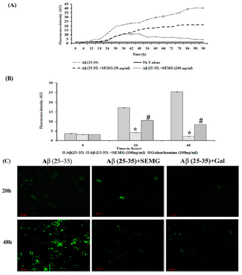 Kinetic study on effect of SEMG against Aβ aggregation was evaluated by treating freshly prepared solution of Aβ (25–35) monomers (100 μM) in Tris-HCl (pH 7.4) in the presence and absence of various doses of SEMG (25 and 50 μg/mL) for 96 h at 37°C. Every 6 h, aliquots of reaction mixture were taken and assessed for aggregation based on the Thioflavin-T (Th-T) assay.