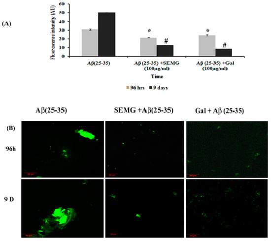 Effect of SEMG on the disintegration of preformed mature fibrils. (A) Th-T fluorescence assay, (B) confocal laser scanning microscopic analysis. *,# p < 0.05 represents statistically significant difference in comparison with treated groups with control and positive control group.