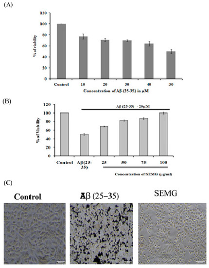Pre-seeded Neuro2A cells (2 × 105 cells/mL) were treated with various doses of Aβ (25–35) (10–50 µM) for 24 h followed by PBS wash and treatment with MTT (1 mg/mL) for 3 h at 37 °C. The cells were subjected to PBS wash and the blue-colored formazan crystals were solubilized by DMSO (Dimethyl sulfoxide). Absorbance was measured at 540 nm using a multi-plate reader. Protective effect of SEMG (20–100 μg/mL) was assessed by pre-treating with SEMG for 2 h prior to Aβ (25–35) at 20 μM concentration and incubated for 24 h, and then subjected to the MTT assay [22].