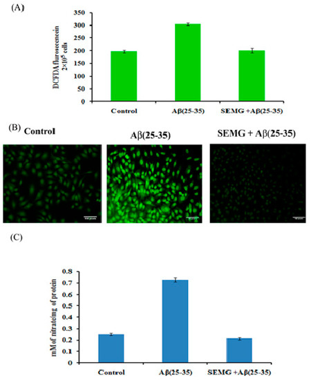 Multiple evidences revealed that Aβ peptide during oligomerization induced the release of H2O2 in the presence of transition metal ions Fe2+ or Cu2+, which in turn promotes Fenton chemistry enhancing the production of ROS and RNS, leading to lipid peroxidation and protein oxidation [42,43]. In the present study, the effect of SEMG was assessed by measuring intracellular ROS and RNS levels. DCFH-DA, a fluorescent probe, was used to assess the cellular ROS level. Results revealed that cells treated with Aβ showed a one-fold increase in fluorescent intensity (303.66 ± 4.92 a.u) when compared to vehicle control (196.33 ± 4.92 a.u.), while SEMG-treated groups attenuated Aβ-induced ROS level, restoring it to normal (Figure 7A). Confocal microscopic images showed increased green fluorescence in Aβ-treated groups, while SEMG-treated groups showed reduced green fluorescence similar to vehicle control (Figure 7B).