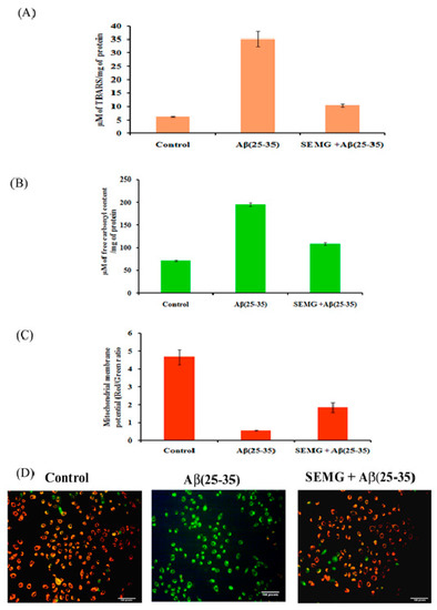Multiple laboratory and clinical evidences revealed the presence of elevated levels of oxidative stress markers of lipid peroxidation and protein oxidation, like 4-hydroxynonenal and protein carbonyl content, in the brain of AD patients [44,45]. To verify the free radical scavenging activity of SEMG, the degree of lipid peroxidation and protein oxidation with thiobarbituric acid reactive substances (TBARS) and protein carbonyl content (PCC) as indicators was assessed in Aβ-exposed cells pretreated with SEMG. In the present study, cells treated with Aβ showed a five-fold increase in TBARS and a two-fold increase in PCC content (195 ± 4.47 µM of free carbonyl content/mg of protein), while SEMG-treated cells averted lipid peroxidation (35.13 ± 2.86 µM of TBARS/mg of protein) and protein oxidation (109 ± 3.22 µM of carbonyl content/mg of protein), restoring its level similar to vehicle control (Figure 8A, B). The restoration of TBARS and protein carbonyl content of SEMG might be due to the antioxidant potential of MG, which quenched the ROS and RNS liberated by Aβ-induced toxicity.