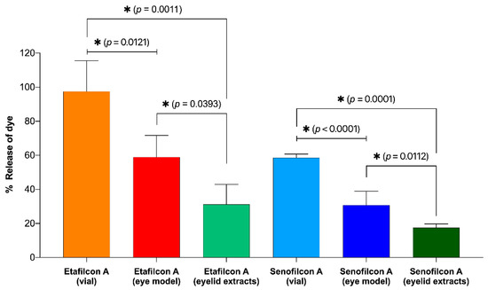 - Bajgrowicz, M.; Phan, C.M.; Subbaraman, L.N.; Jones, L. Release of Ciprofloxacin and Moxifloxacin from Daily Disposable Contact Lenses from an in Vitro Eye Model. Investig. Ophthalmol. Vis. Sci. 2015, 56, 2234–2242. [Google Scholar] [CrossRef]