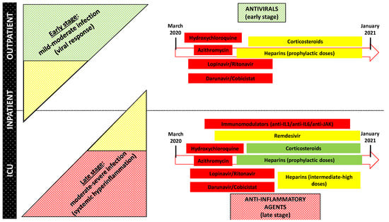 Notably, a close relationship between the severity of COVID-19 clinical scenarios (from outpatient to intensive care unit admission) and the use of specific repurposed agents (antiviral or anti-inflammatory properties) may be identified (Figure 1). Antivirals are more appropriate for the early phase of infection, while anti-inflammatory/immunomodulatory agents should be reserved for the treatment of systemic hyperinflammation characterizing the late stages []. Consequently, the potential efficacy both of a certain route of administration and innovative pharmaceutical formulations is strictly dependent on the stage of the disease, given that pulmonary delivery of repurposed agents may be efficaciously implemented only in patients who maintain spontaneous breathing and adequate pulmonary function, becoming more challenging in severe cases of respiratory failure requiring mechanical ventilation.
