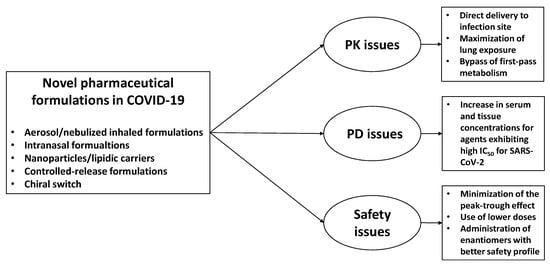 From a pharmaceutical point of view, the drug repurposing strategy to face COVID-19 has offered a unique opportunity to devise novel research strategies. In this setting, the repurposing of a specific agent for a different therapeutic indication may give rise to a range of safety and efficacy challenges that could be addressed through a pharmaceutical formulation or drug delivery approach []. Consequently, both reformulating already approved drugs to overcome physicochemical, pharmacokinetic or safety issues (such as instability, solubility, poor membrane permeability, compromised bioavailability, pulmonary delivery, inadequate duration of action, or side effects), and developing alternative and more appropriate routes of administration (e.g., pulmonary or intranasal to maximize exposure in the primary infection site of SARS-CoV-2) represent specific pharmaceutical strategies aimed at improving the risk–benefit profile of the repurposed agents [,].