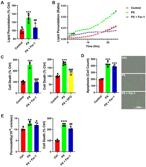 We have previously reported that neither antioxidants nor apoptosis inhibitors were able to rescue barrier functions in our BBB injury model [43,44], suggesting that the source of this damage is not a direct result of either process. We aimed to ascertain whether inhibiting a specific type of oxidative stress in the BLEC would attenuate the damage to BBB integrity. Since lipid compositions and their physiochemical properties greatly influence barrier functions [60] and intercellular lipids are a common target for oxidation by ROS [61,62], we measured lipid peroxidation at the initial insult event. A rapid and significant increase in lipid peroxidation was observed (Figure 1A). Additionally, we measured lipid peroxidation over a 24-h period using a live-cell analysis system and found that lipid peroxides accumulated over time (Figure 1B). The lipid peroxidation inhibitor Ferrostatin-1 (Fer-1) [63] abrogated this damage throughout the entire experiment (Figure 1A,B). Cell death was abrogated in the presence of Fer-1, indicating that lipid peroxidation contributed to the increased cell toxicity (Figure 1C). These results suggested that insult to BLEC might lead to ferroptosis for which Fer-1 is a classic and specific blocker [63]. The ferroptotic cell death entails two essential components: lipid peroxidation and accumulation of free iron ions [63,64]. We therefore treated cells with Desferal (DFO), an FDA-approved drug which acts as an iron chelator. Indeed, DFO significantly rescued cell toxicity (Figure 1C). To further confirm the ferroptosis process, the absence of apoptosis needed to be established [63,65]. The kinetics of apoptosis induction were measured with live cell imaging of caspase-3 activation for the duration of 24 h subsequent to endothelium exposure to PX. We found that PX induced apoptosis in BLEC, and that the addition of Fer-1 did not abrogate this effect (Figure 1D). Therefore, even though most of the classic ferroptosis signatures existed, it was inaccurate to classify this process as ferroptosis per se since ultimately, apoptosis occurred (Figure 1D). We then asked whether this ferroptosis-like process could account for the impaired functionality observed in the BBB model; Even though Fer-1 abrogated cell death (Figure 1C), it did not rescue barrier function from increased permeability (Figure 1E). Collectively, these results suggested that there were at least two processes that occurred as a result of PX damage to the brain endothelial cells. Initially, the cells rapidly responded to the PX challenge by lipid peroxidation; however, after 12 h, additional cell death pathways came into play, such as apoptosis. These seemed to be independent pathways, since BLEC underwent apoptosis even in the presence of Fer-1 (Figure 1D). Additionally, neither ferroptosis nor apoptosis seemed to be solely accountable for increased BBB permeability since two classic blockers of these programmed cell death processes (Fer-1 and the pan caspase inhibitor ZVAD) significantly attenuated cell death but failed to rescue the damage to barrier permeability (Figure 1E and [43]).