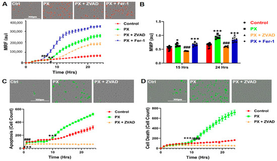 Since Fer-1 failed to inhibit PX-induced apoptosis (Figure 1D), we assumed that apoptosis was not a direct result of the initial lipid peroxidation. Since inhibition of several oxidative stress associated events in our model, such as lipid peroxidation (Figure 1B) and total cell ROS formation [43] did not rescue the BBB integrity, we next measured mitochondrial ROS production. Mitochondrial superoxide formation was significantly increased 9 h after PX treatment in a time dependent manner (Figure 2A). Mitochondrial stress initiates the chain of events leading to apoptosis [66], we therefore treated the cells with ZVAD, which significantly decreased PX-induced mitochondrial ROS formation, while Fer-1 exacerbated it (Figure 2A), suggesting that this organelle-specific ROS formation might be responsible for the chain of events leading to apoptosis. It has been reported that mitochondrial superoxide formation leads to a decrease in mitochondrial membrane potential, resulting in mitochondrial membrane permeation [67] which is the next step in the chain of events terminating in apoptosis. We therefore performed a live cell imaging assay to measure the permeation of the mitochondrial membrane in cells treated with PX. At 15 h post treatment, the permeation started to increase significantly in comparison to the control cells, increasing until 24 h. ZVAD abrogated this effect and Fer-1 had no significant effect at 24 h (Figure 2B). Additionally, ZVAD prevented the activation of caspase-3 and reduced the basal apoptosis process of untreated cells after 24 h (Figure 2C). Concordantly, ZVAD nullified cell cytotoxicity throughout the 24-h treatment (Figure 2D). Together, these results suggest two chain of events and their kinetics in this model of injured endothelium; one results in apoptosis while the other leads to a ferroptosis-like process. However, even though these experiments shed light on both chains of events and provided insights into their time frames, the source of functional damage in the brain endothelium is yet to be clarified.