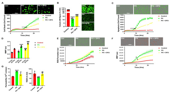 Since several ROS processes were evident in our model, but had no direct effect on BBB integrity, we wanted to elucidate the effect of DFO in our model since it rescued BLEC from PX-induced cell death (Figure 1B). Indeed, DFO rescued cytotoxicity throughout the 24-h window (Figure 3A). Since DFO is an iron chelator, we hypothesized that damage to BLEC deregulated the cellular iron homeostasis. Indeed, PX increased the labile iron pool within the cell, while DFO moderately but significantly rescued this effect (Figure 3B). Unlike Fer-1, DFO did not rescue the cells exclusively through the ferroptosis-like process since it also significantly decreased apoptosis (Figure 3C). Since apoptosis was inhibited, we next measured the effect of DFO on mitochondrial membrane permeation, a hallmark of the apoptosis pathway [68]. Conversely, DFO exacerbated the damage to the mitochondrial membrane (Figure 3D), suggesting that DFO did not affect apoptosis through the classic chain of events that are associated with the breakdown of the mitochondrial membrane. We next measured the cellular ROS formation since the Fenton reaction is a catalytic process in which iron is oxidized by hydrogen peroxide, a product of mitochondrial oxidative respiration, ultimately leading to the creation of a highly toxic hydroxyl free radical, which results in oxidative stress [69]. Surprisingly, DFO had no significant effect on cellular ROS formation (Figure 3E). It has been reported that the Fenton reaction initiates the production of hydroxyl radicals within the mitochondria [70], leading to oxidative stress. Indeed, DFO significantly decreased mitochondrial ROS formation (Figure 3F), suggesting that DFO rescues cell viability through inhibition of mitochondrial superoxide formation. Conversely, DFO significantly increased the permeation of the mitochondrial membrane rather than preventing it (Figure 3D) indicating that DFO does not rescue cell viability via the classic apoptosis pathway. Our next step was to test whether the ability of DFO to rescue cell viability in BLEC also extended to their functionality. DFO significantly rescued the barrier function as manifested by preventing the increase in permeability and the decrease in transendothelial electrical resistance (TEER) in the BBB model exposed to PX (Figure 3G). This confirms that DFO rescues both cell viability and barrier functionality. Collectively, these results highlight the therapeutic potential of addressing iron dyshomeostasis in the treatment of BBB damage since this approach has the dual effect of restoring loss of function as well as inhibiting cell toxicity in the endothelial cells of the BBB.