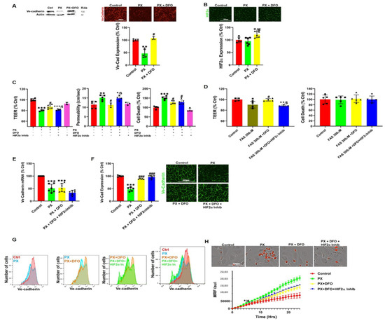Mouse anti-VE-cadherin antibody (sc-9989) diluted 1:50 was obtained from Santa Cruz Biotechnology (Dallas, TX, USA). Cy and Alexa Fluor-conjugated secondary antibodies were acquired from Jackson Immunoresearch (Philadelphia, PA, USA) and Molecular Probes (Eugene, OR, USA), respectively, and used for immunocytochemistry. HIF2α inhibitor [51] (Axon 2034) was obtained from Axon Medchem (Hanzeplein, The Netherlands). Z-VAD-FMK was obtained from Adooq-bioscience (187389-52-2, Irvine, CA, USA) and Santa Cruz Biotechnology (sc-3067, Dallas, TX, USA). Marimastat from Santa Cruz Biotechnology (sc-202223, Dallas, TX, USA), MG-132 from Promega (G9951, Madison, WI, USA). Cytotoxgreen was obtained from Essen BioScience (Ann Arbor, MI, USA) and CellROXgreen from Molecular Probes (Eugene, OR, USA). PX-ethyl was purchased from Sigma (St. Louis, MO, USA). According to the Sigma safety data sheet, safety measures of eye shields, face shields, full-face respirator, and gloves should be taken. PX was used according to our previously reported protocol [43,44] All other reagents applied in this study were used in accordance to the known literature and the supplier’s guidelines.