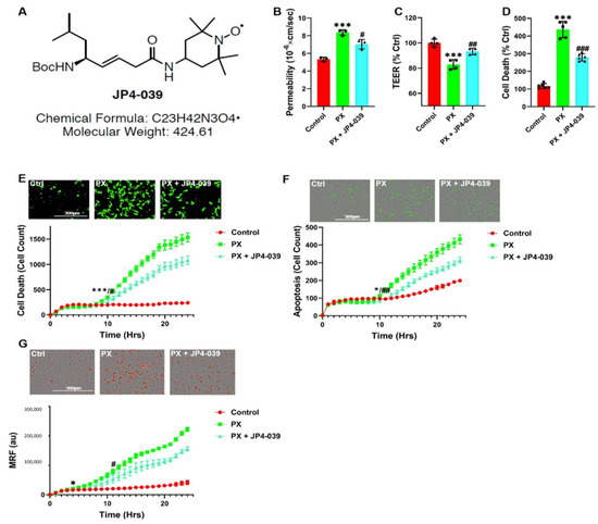 Since the cellular iron homeostasis is a precise and delicately regulated process that is present throughout all cells in the body [75,76], we aimed at identifying another agent that does not elicit such a profound effect on the cellular iron levels. Similar to DFO, this compound should have the potential to mitigate the synergistic effects of increased cell death and decreased cell functionality induced in the damaged BBB. We found that the novel nitroxide, JP4-039 (Figure 5A), significantly rescued permeability in our injury model (Figure 5B) and inhibited TEER decrease (Figure 5C). JP4-039 also inhibited cell death as recorded using the LDH assay (Figure 5D). The cytotoxicity and apoptosis kinetics were measured in the presence of JP4-039. Both processes were initially inhibited at 8 to 10 h and up to 24 h post treatment (Figure 5E,F). We have previously shown that JP4-039 is an antioxidant and electron scavenger that targets the mitochondria [77]. Indeed, JP4-039 significantly inhibited MRF increase (Figure 5G) in PX treated cells. Collectively, these results suggested that the novel nitroxide, JP4-039, offers a therapeutic potential to treat BBB damage, since this compound has the dual effect of rescuing both the viability and integrity of the endothelial cells.