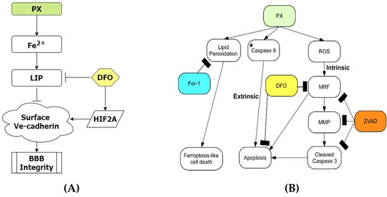 BBB integrity is regulated by the iron dependent HIF2α-Ve cadherin axis. (A) Flowchart elucidating the molecular pathways that regulate BBB integrity in our model. Upon insult the labile iron pool is significantly increased, resulting in damage to the BBB integrity. DFO rescues BBB functionality by inducing the expression of HIF2α that results in the restoration of Ve-cadherin on the cell surface; (B) Flowchart elucidating the molecular pathways initiated in our model. * We have recently reported that inhibiting caspase-8 decreased apoptosis in our model [44]. PX, paraoxon; ZVAD, Z-VAD-FMK; Fer-1, Ferrostatin; MRF, mitochondrial ROS formation; MMP, mitochondrial membrane permeability; au, arbitrary units.