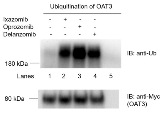 Ixazomib, oprozomib, or delanzomib treatment substantially increased the accumulation of ubiquitinated OAT3 (Figure 1), which was consistent with decreased 20S proteasomal activity in cell lysate in OAT3-expressing cells (Figure 2), stimulated OAT3-mediated transport of estrone sulfate and p-aminohippuric acid (Figure 4, Figure 5 and Figure 6), and increased OAT3 membrane expression (Figure 9). The enhanced transport activity of OAT3 following drug pretreatment resulted from an increase in maximum transport velocity without altering the binding affinity of the transporter (Figure 8). Ubiquitinated OAT3 exhibited the molecular mass above 180 kDa, ~100 kDa more than OAT3 (~80 kDa). As ubiquitin is an 8-kDa polypeptide, OAT3 may be modified by poly- or multiubiquitination (Figure 1).