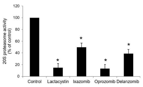 Effect of ixazomib, oprozomib, or delanzomib on the 20S proteasome activity. OAT3-expressing COS-7 cells were treated with lactacystin (10 μM), a classical proteasome inhibitor as positive control, ixazomib (30 nM), oprozomib (200 nM), or delanzomib (30 nM) for 6 h. The 20S proteasome activity of cells was then performed. The 20S proteasome activity was expressed as the percentage of control cells from three independent experiments. Values are means ± S.D. (n = 3). * p < 0.05.